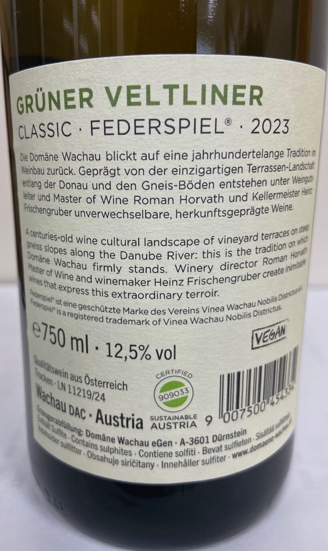 グリューナー・ヴェルトリーナー・フェダースピエルのブドウは慎重に厳選されました。最新のブドウ受け入れシステムにより、100%健康なブドウ素材のみを選択できます。ステンレス鋼での短時間の浸軟、穏やかな圧搾、一晩の沈降、および温度制御された発酵が、醸造プロセスを定義します。瓶詰めする前に、ワインは数週間、細かい粕で熟成しました。
